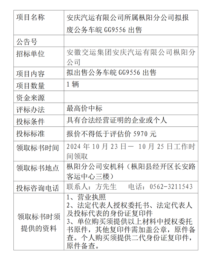 樅陽(yáng)分公司擬報(bào)廢公務(wù)車(chē)皖GG9556出售公告
